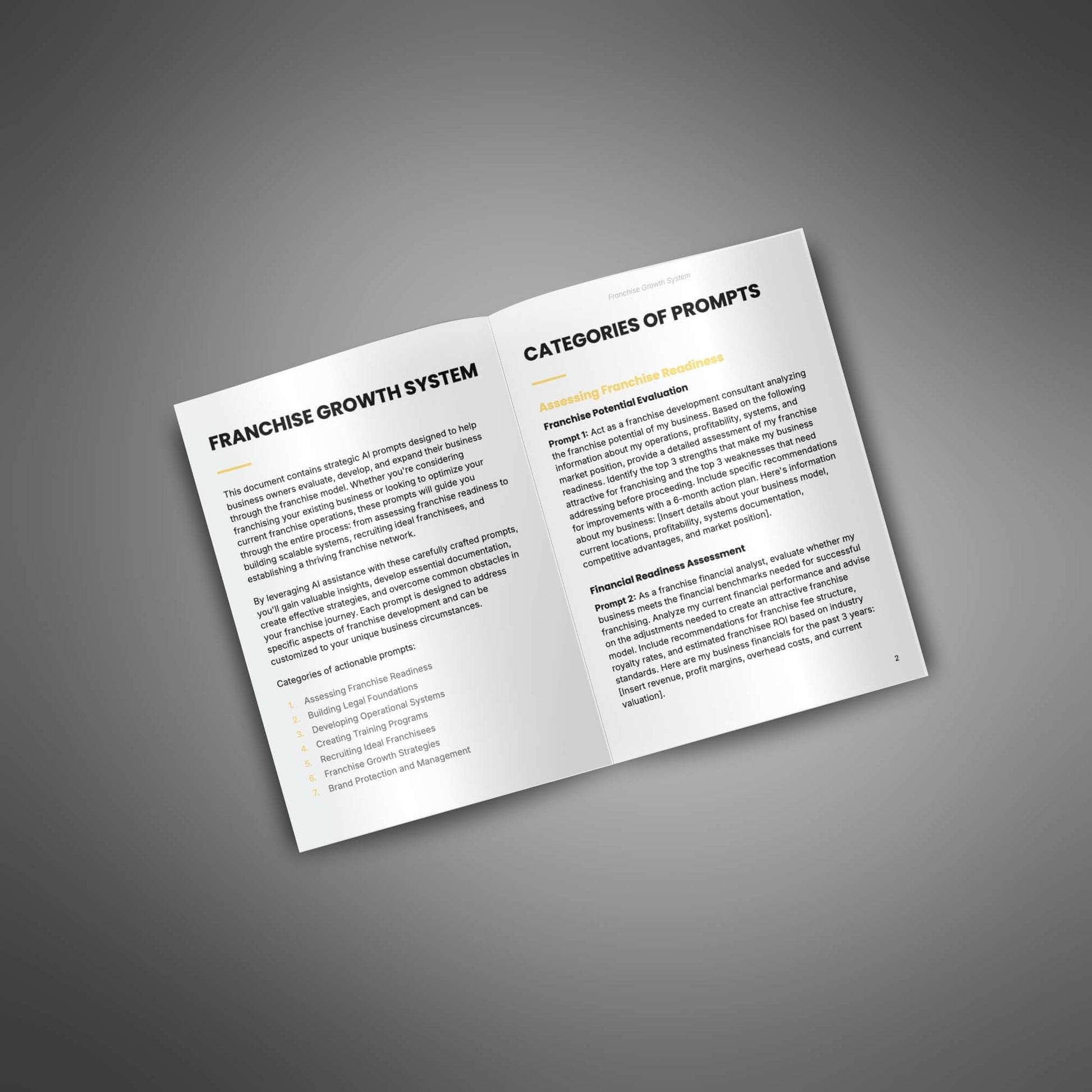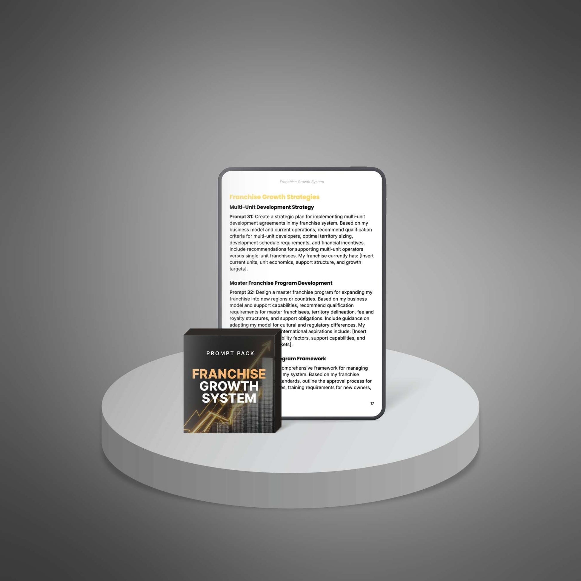 Offer your customers a powerful prompt pack that equips them with the tools they need to grow a successful franchise. Whether they are just starting to franchise or already managing multiple locations, this pack provides actionable prompts to streamline operations, boost performance, and scale with confidence.