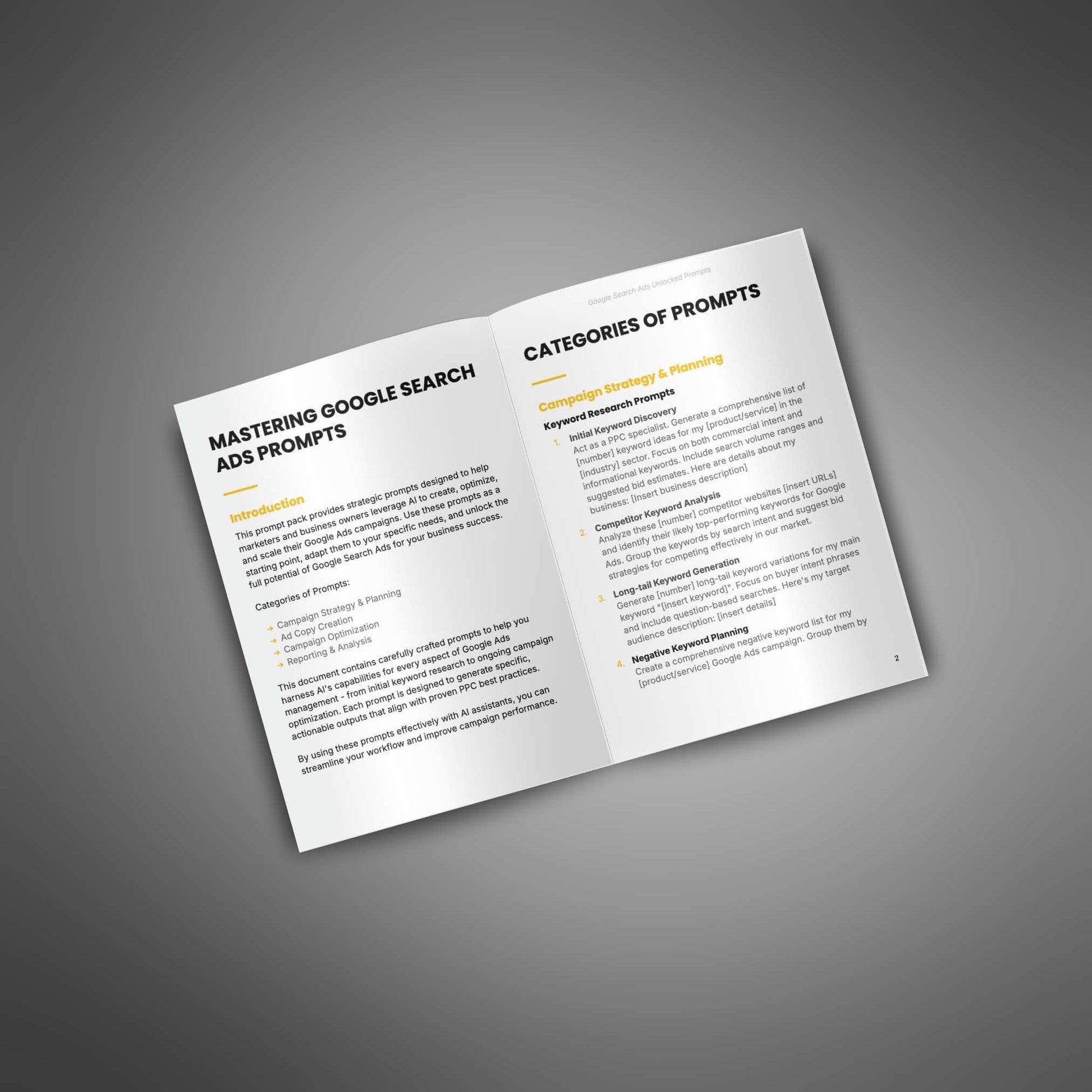 - Prompts for writing compelling ad copy, including headlines, descriptions, and calls-to-action.