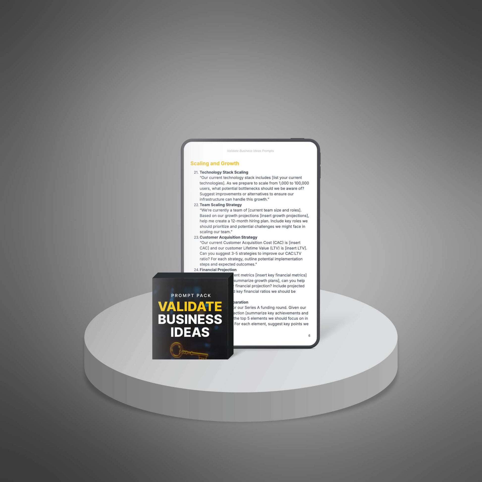 Offer your customers a powerful prompt pack that equips them with the tools they need to validate and grow their startups. This pack provides actionable prompts to streamline decision-making, optimize products, and confidently scale their business ideas.