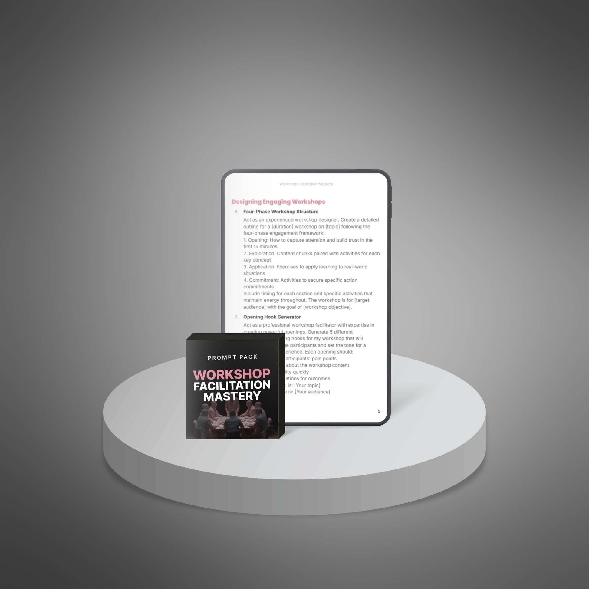 Offer your customers a powerful prompt pack that equips them with the tools they need to succeed in workshop facilitation. Whether they are just starting or want to scale, this pack provides actionable prompts to help them lead better sessions, land more clients, and grow their income with confidence.